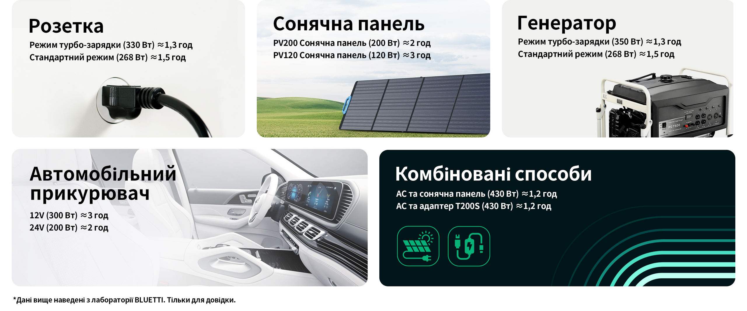 - 6 способів зарядки (AC/Сонячна/Автомобіль/Генератор/AC+Сонячна/AC+Адаптер);